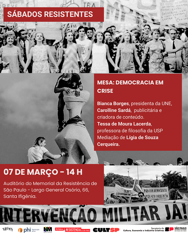 O Memorial da Resistência de São Paulo, museu da Secretaria da Cultura, Economia e Indústria Criativas do Estado de São Paulo, e o Núcleo de Preservação da Memória Política convidam para o primeiro Sábado Resistente de 2026, a ser realizado no dia 07 de março, às 14h, no Auditório do 5º andar do Memorial da Resistência – Largo General Osório, 66 – Luz (ao lado da Sala São Paulo). O ciclo Sábados Resistentes, em 2026, aborda os temas emergentes que atravessam a democracia contemporânea, como as transformações tecnológicas, a crise climática, a desigualdade social, e a desinformação massificada. Ao longo do ano, as discussões exploram os desafios que pressionam as instituições democráticas, mas também buscam caminhos possíveis para o fortalecimento da cidadania. Com o tema Democracia em crise, o encontro discute as múltiplas faces da crise democrática contemporânea. Realizado na véspera do 8 de março, Dia Internacional das Mulheres, o debate será conduzido por uma mesa composta exclusivamente por mulheres, reafirmando a centralidade de suas vozes na reflexão sobre os rumos da democracia. Para esta conversa, contaremos com a participação de Bianca Borges, estudante de Letras no Instituto Federal de São Paulo, bacharel em Direito pela Universidade de São Paulo e presidenta da União Nacional dos Estudantes (2025-2027); Carolline Sardá, publicitária e historiadora em formação, criadora de conteúdo sobre história, política e atualidades; e Tessa de Moura Lacerda, professora de filosofia na Universidade de São Paulo. A mediação será feita por Lígia de Souza Cerqueira, conselheira do Núcleo Memória, advogada e mestranda em Relações Internacionais pela Unifesp. Será emitido certificado de participação para as pessoas presentes, mediante registro no local. O evento também contará com transmissão online, através dos canais: Núcleo Memória @nucleomemoria Memorial da Resistência @memorialdaresistencia Tutaméia @tutameiaTV. PROGRAMAÇÃO PARTICIPANTES Mediação de Lígia de Souza Cerqueira – Mestranda em Relações Internacionais pela Universidade Federal de São Paulo (UNIFESP). Assistente de Pesquisa do Centro de Pesquisa Aplicada em Direito e Justiça Racial da Fundação Getúlio Vargas (FGV-SP). Associada à Frente Ampla Democrática pelos Direitos Humanos (FADDH). Pós-graduada em Direitos Humanos pela Universidade Católica Portuguesa (UCP). Conselheira do Núcleo Memória. Bianca Borges – Estudante de Letras no Instituto Federal de São Paulo, bacharel em Direito pela Universidade de São Paulo e presidenta da União Nacional dos Estudantes (2025-2027). Ex-presidenta da União Estadual dos Estudantes de São Paulo (2023-2025). Carolline Sardá – Publicitária e historiadora em formação, criadora de conteúdo sobre história, política e atualidades com perspectiva feminista marxista. É fundadora do Clube de Leitura Feminista e da Academia de Debates Estratégicos e Mulheres na História, iniciativas voltadas à formação política e ao fortalecimento do protagonismo feminino. Também trabalha com comunicação política e marketing no Instituto Conhecimento Liberta. Tessa de Moura Lacerda – professora Livre-docente de Filosofia na Universidade de São Paulo (USP). Especialista em Filosofia Moderna, também estuda a relação entre história, memória e testemunho; e as questões de gênero a partir da filosofia. É autora de Pela memória de um pa[í]s. Gildo Macedo Lacerda, presente (2023), A filosofia expressiva de Leibniz (2025), As paixões (2013), entre outros livros, além de inúmeros artigos. Editora da revista Cadernos espinosanos. Estudos sobre o Pensamento do Século XVII, e da Revista NÓS - feminismos, transfeminismo e teoria queer, ambas da USP. Coordenadora do grupo NÓS - Grupo de estudos sobre feminismos da USP.