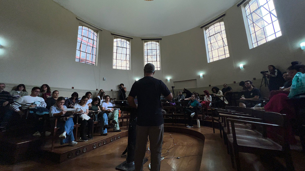 Oliveira começou explicando que a construção dos Direitos Humanos acordados em 1948 com a Declaração oficial da ONU (Organização das Nações Unidas), assim como todas as conquistas sociais, nasce de um longo período de conflitos, até serem reconhecidos com o objetivo de que atrocidades do passado não se repitam na história presente.